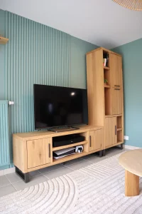 Dans le salon, les panneaux tasseaux Orac peints ton sur ton apportent de la structure au mur et se prolongent visuellement grâce au tapis circulaire, qui rappelle les lignes d’un jardin zen. Cette verticalité se retrouve aussi dans le meuble TV et l’étagère en bois, aux façades nervurées, créant une belle cohérence dans l’espace.