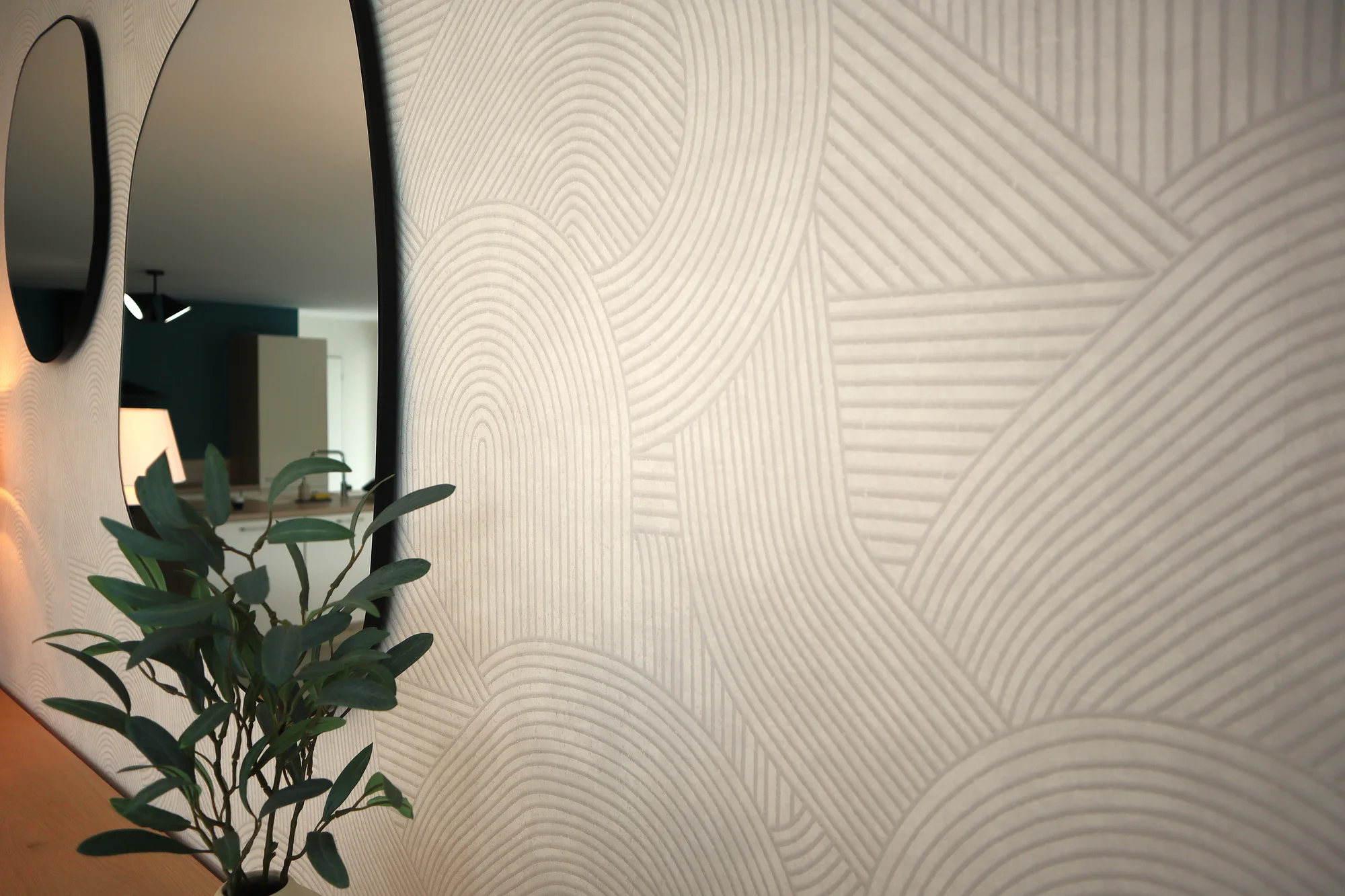 Côté salle à manger, un papier peint au motif inspiré du sable d’un jardin japonais reprend l’esprit du tapis du salon. Cette continuité visuelle renforce l’unité entre les différents espaces du séjour.