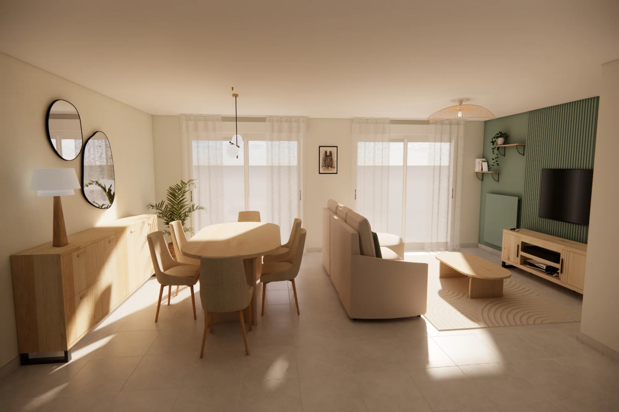 Pour ce projet, j’ai réalisé une modélisation 3D et proposé une liste shopping de mobilier et accessoires déco. Nous avons choisi une palette douce de verts et de beiges, associée à des matériaux naturels comme le bois et les tissus texturés.