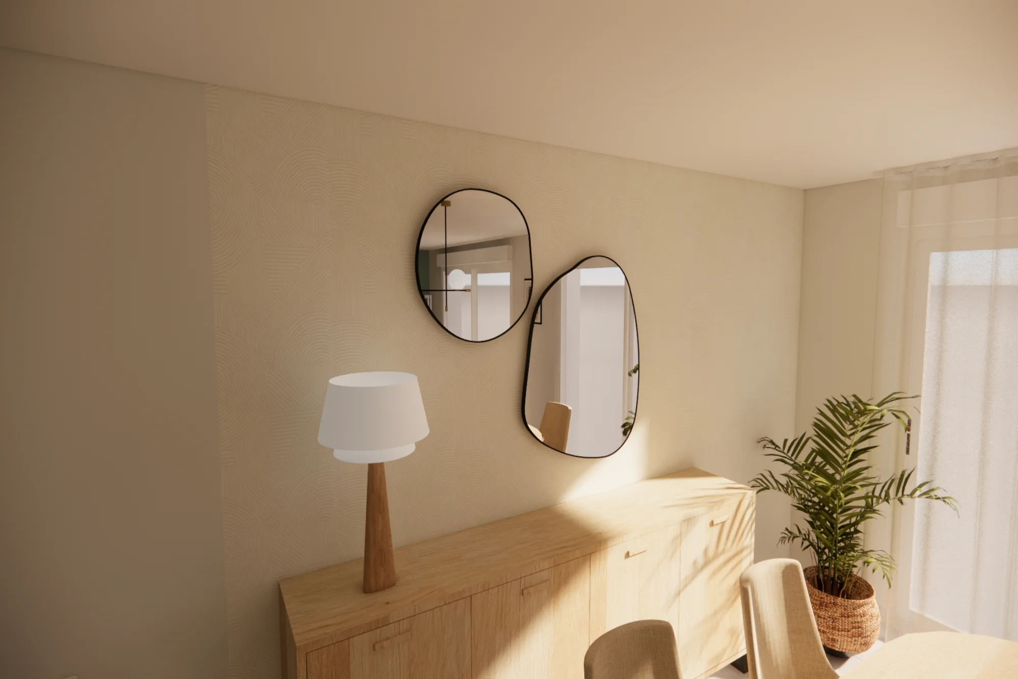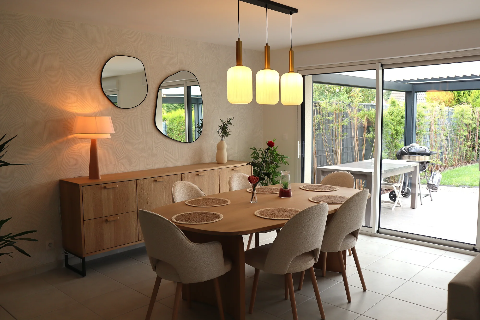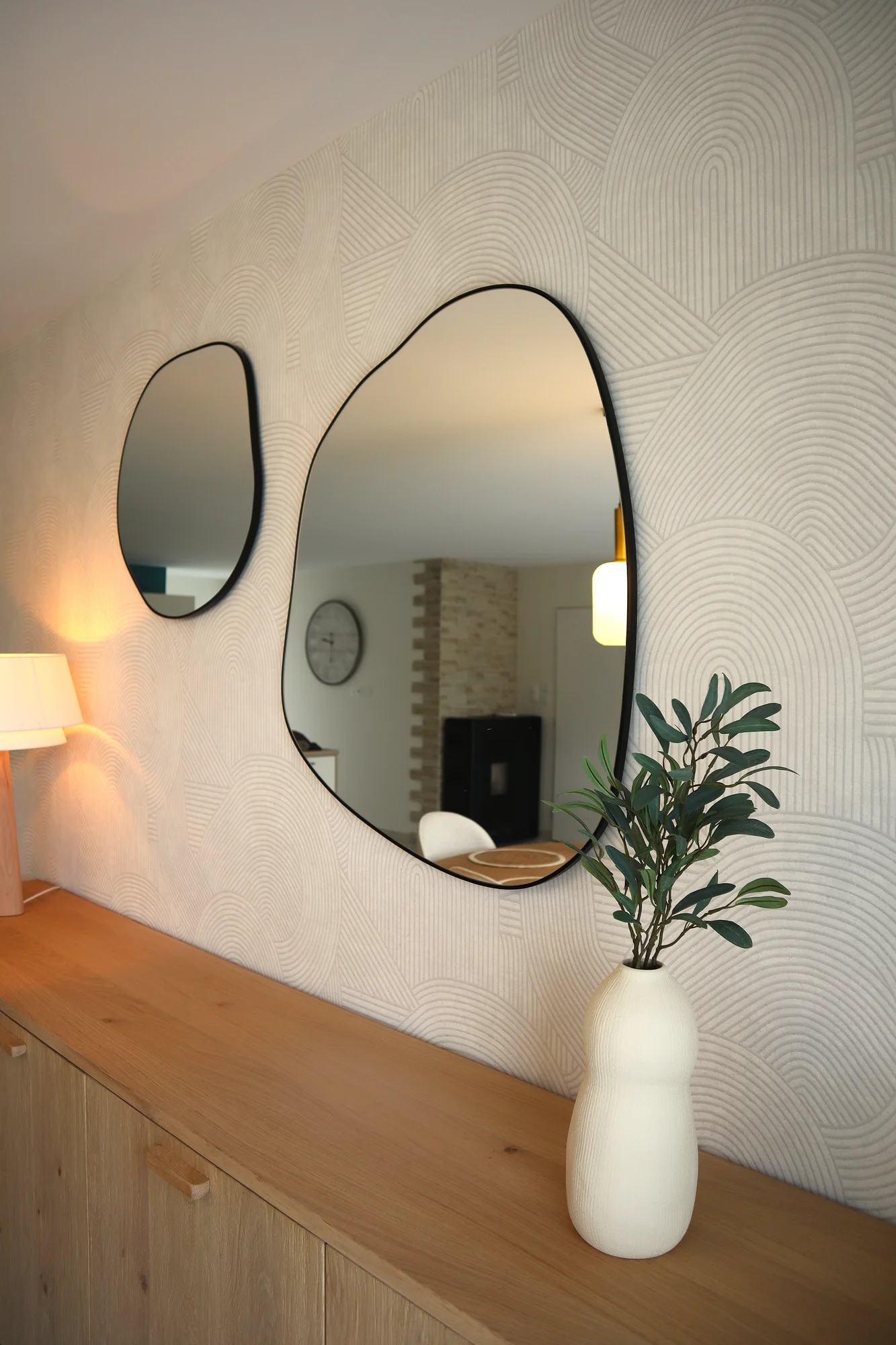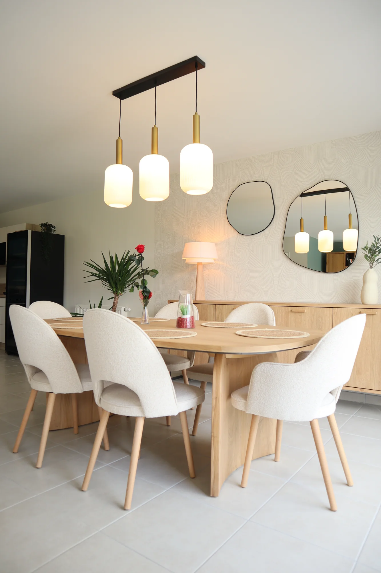 Pour adoucir l’ensemble, nous avons choisi du mobilier aux lignes arrondies : tables, chaises en tissu beige clair, miroirs organiques. L’éclairage, quant à lui, s’inspire des ambiances japonisantes : suspension naturelle au-dessus du salon et lampes aux matériaux bruts, pour un intérieur zen et cosy.