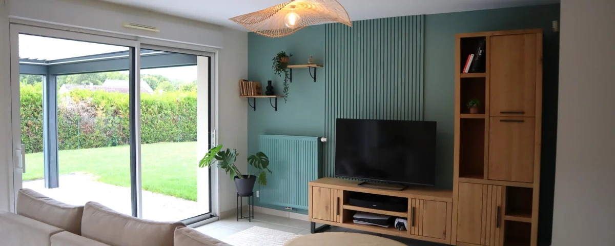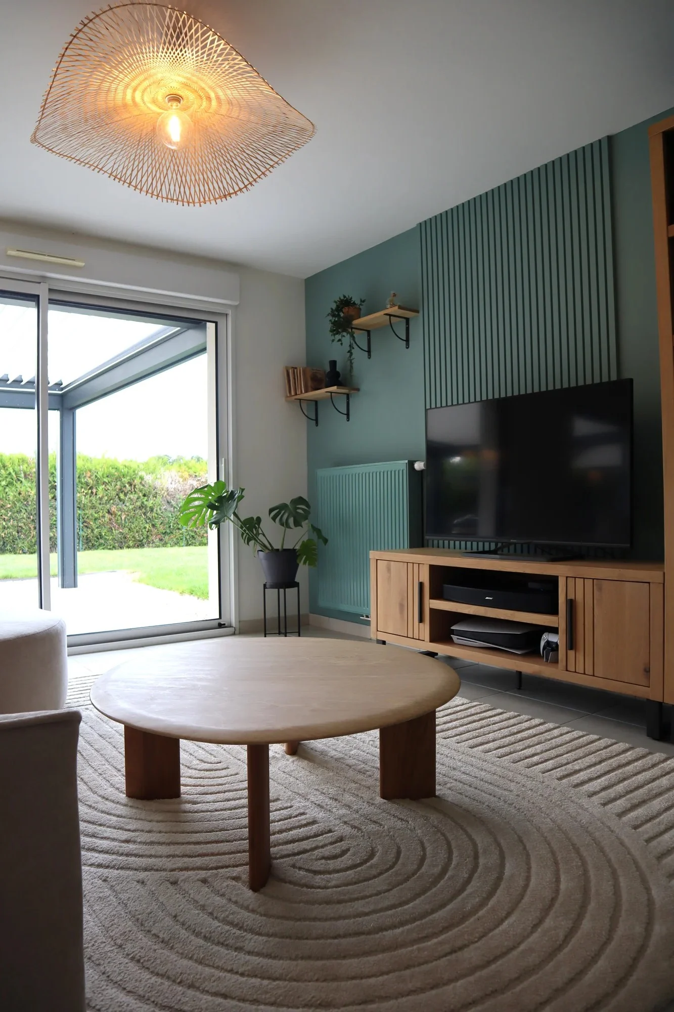 Dans le salon, les panneaux tasseaux Orac peints ton sur ton apportent de la structure au mur et se prolongent visuellement grâce au tapis circulaire, qui rappelle les lignes d’un jardin zen. Cette verticalité se retrouve aussi dans le meuble TV et l’étagère en bois, aux façades nervurées, créant une belle cohérence dans l’espace.