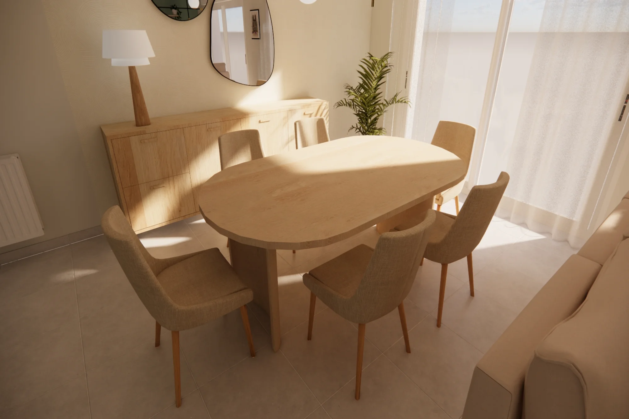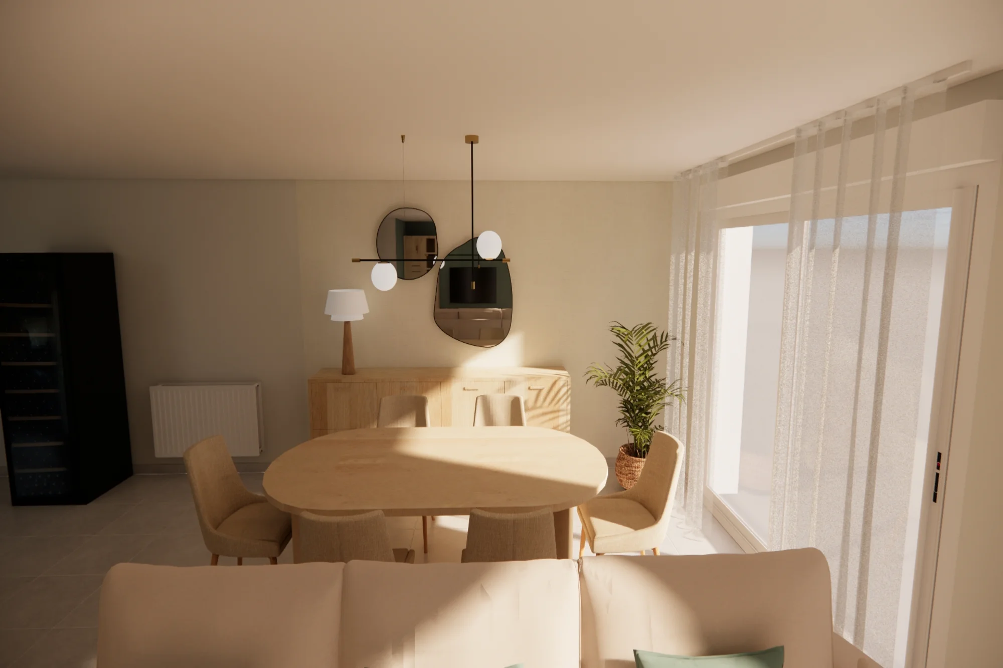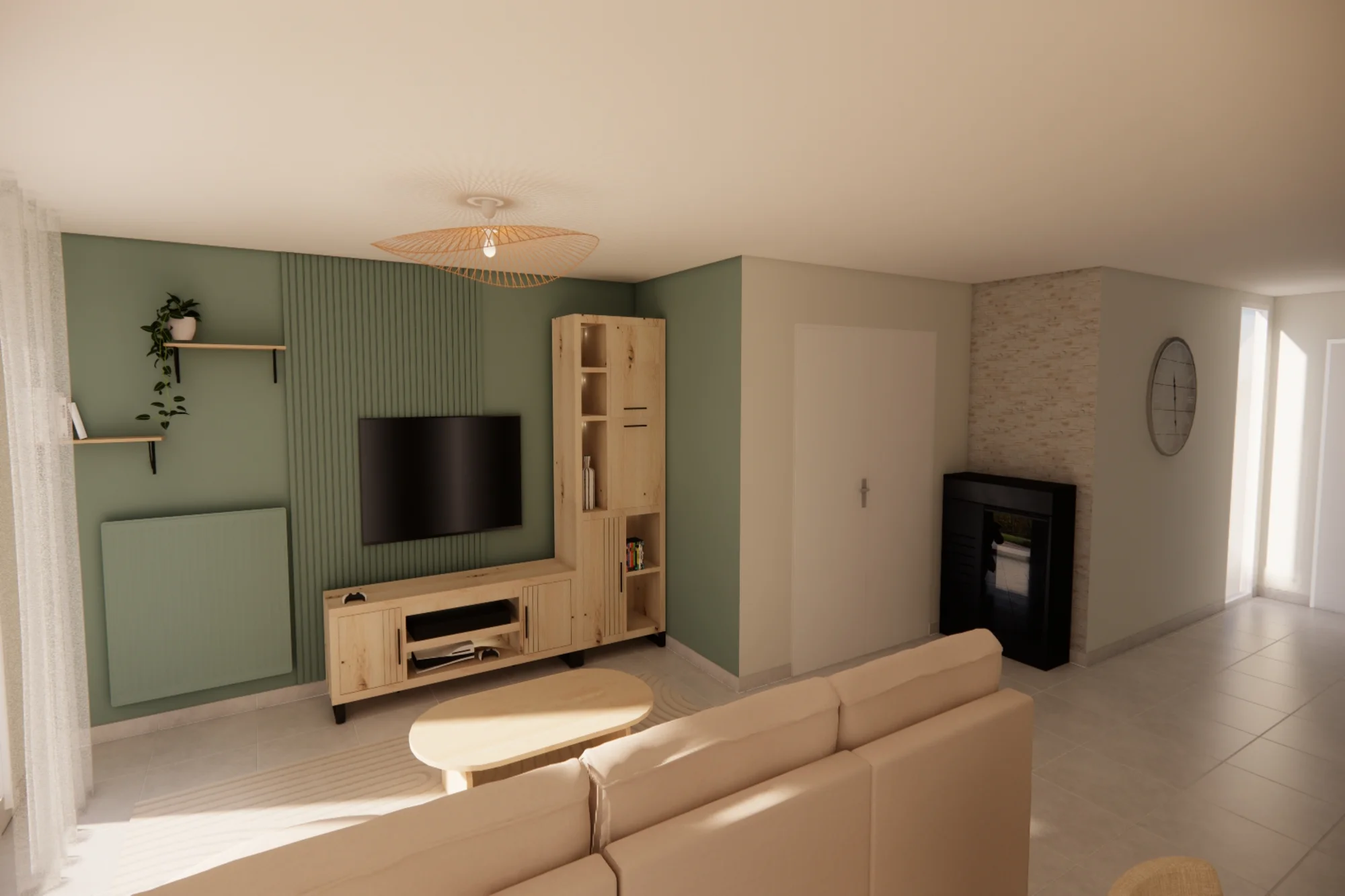Pour ce projet, j’ai réalisé une modélisation 3D et proposé une liste shopping de mobilier et accessoires déco. Nous avons choisi une palette douce de verts et de beiges, associée à des matériaux naturels comme le bois et les tissus texturés.