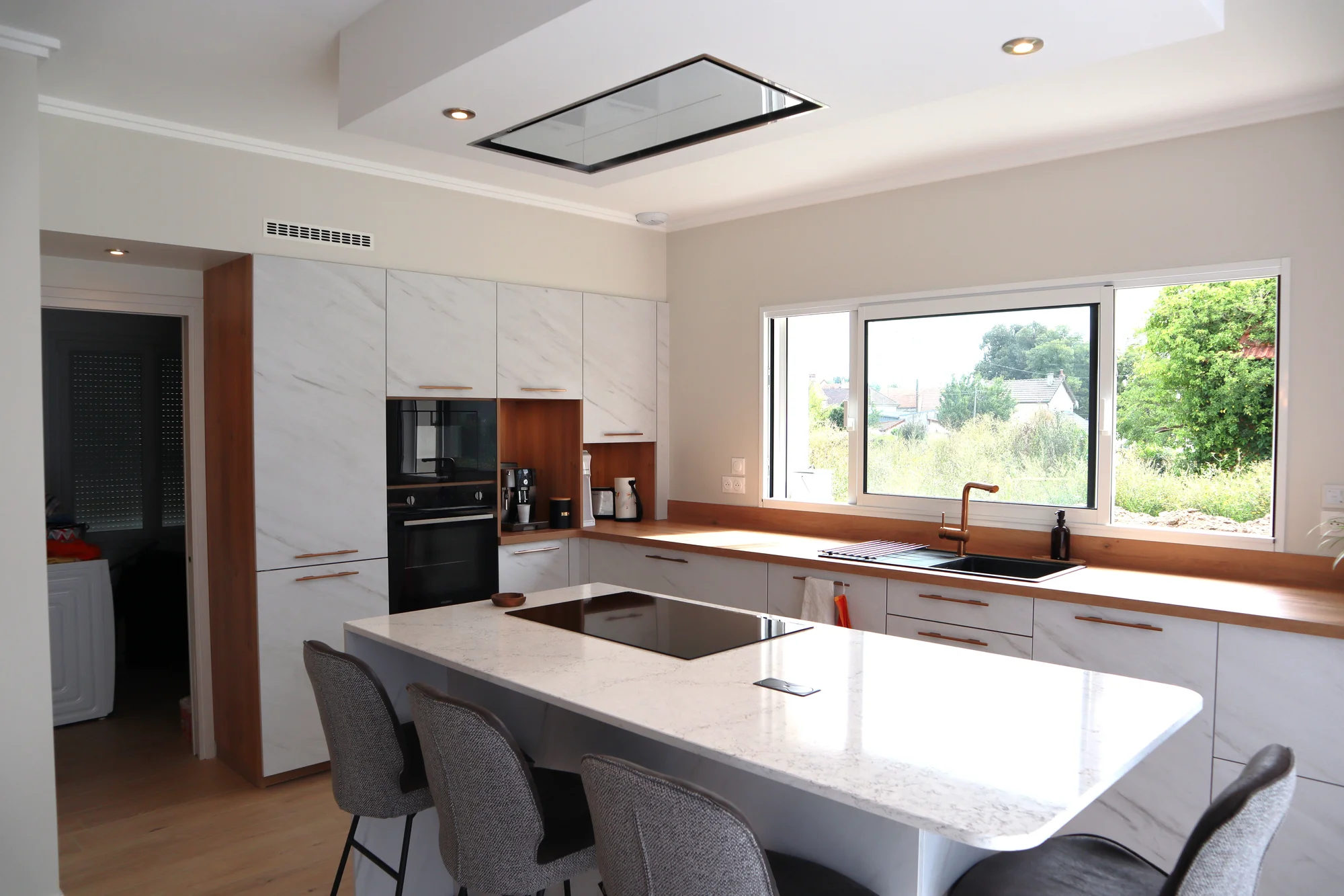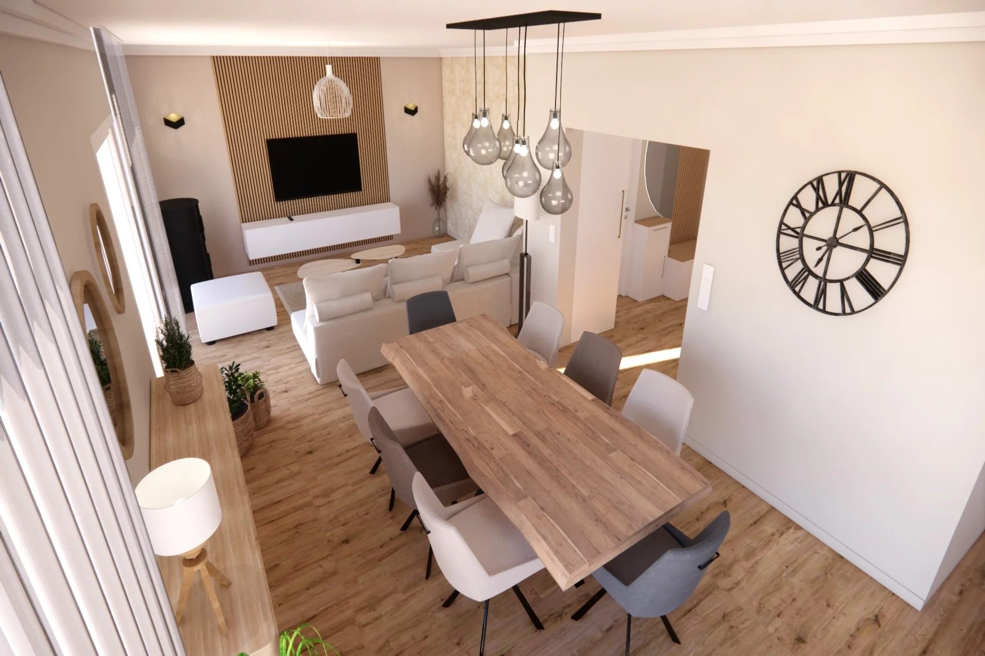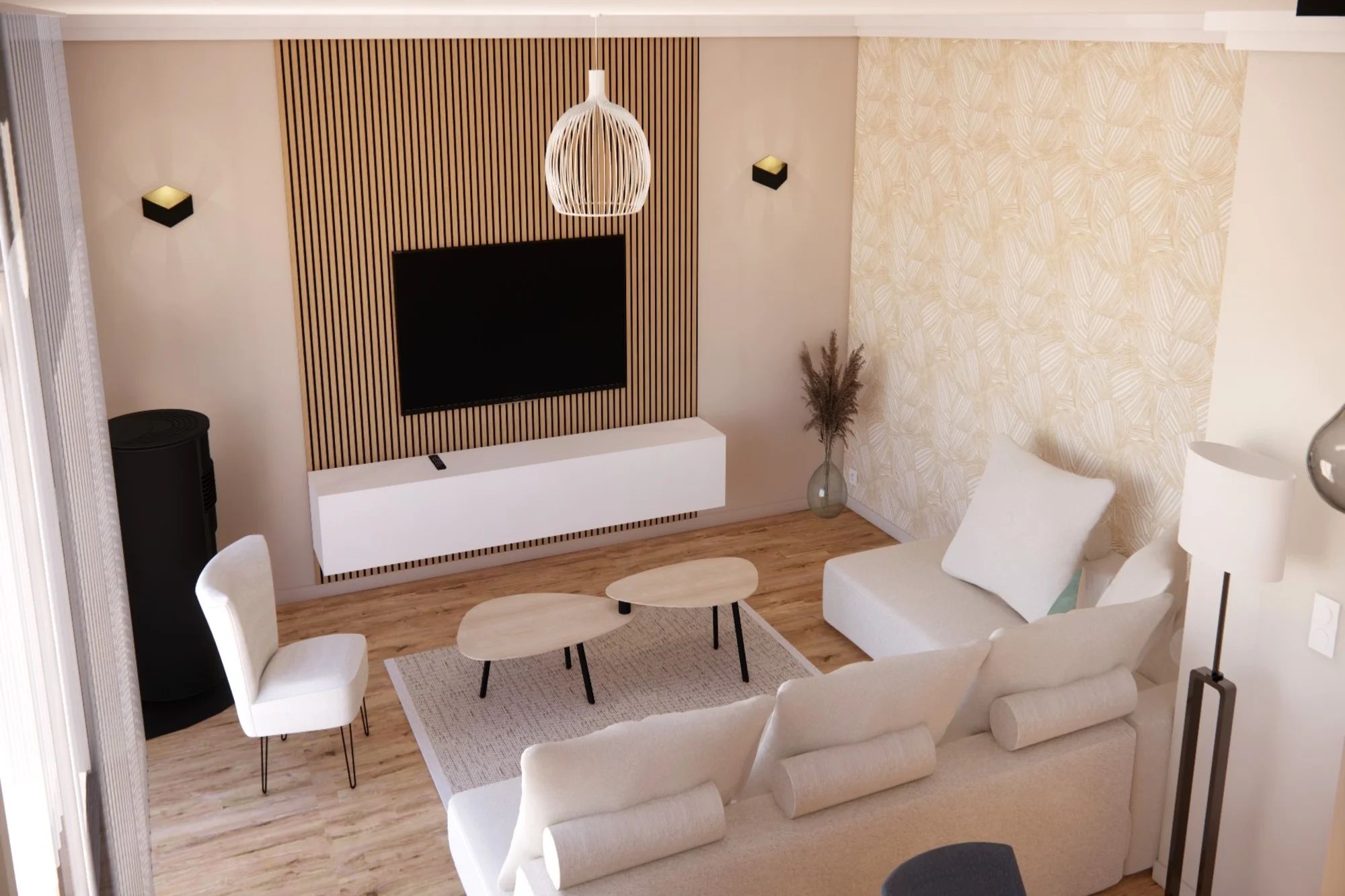 J’ai accompagné le couple dans l’agencement complet de leur séjour : salon et salle à manger. À partir de plans 3D SketchUp avec cotations et de rendus réalistes réalisés avec Enscape, ils ont pu se projeter facilement dans leur futur intérieur grâce à une immersion totale. La cuisine, quant à elle, a été dessinée par Cuisinella. J’ai assuré un rôle de conseil sur le choix des matières et validé l’implantation proposée par le cuisiniste afin de garantir la cohérence d’ensemble.