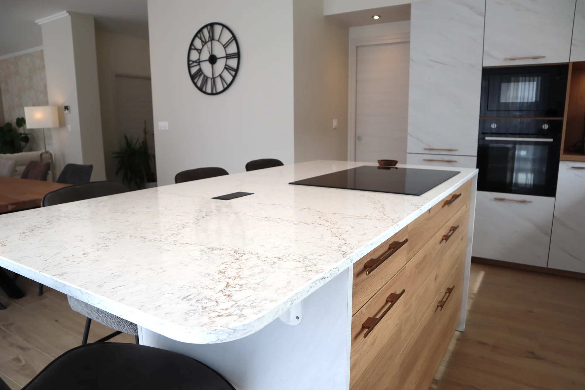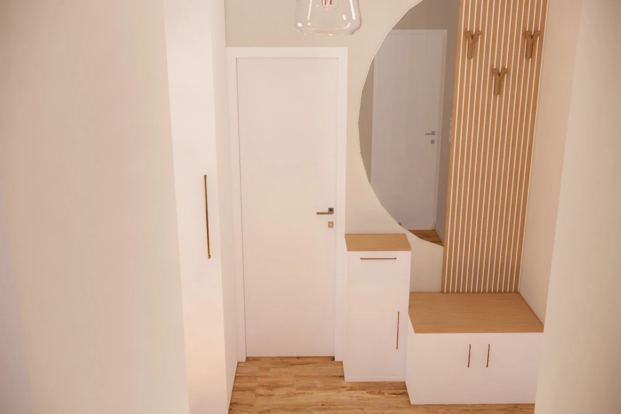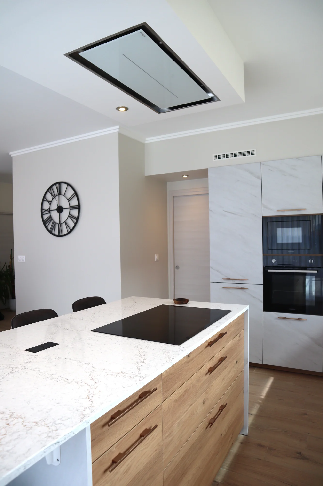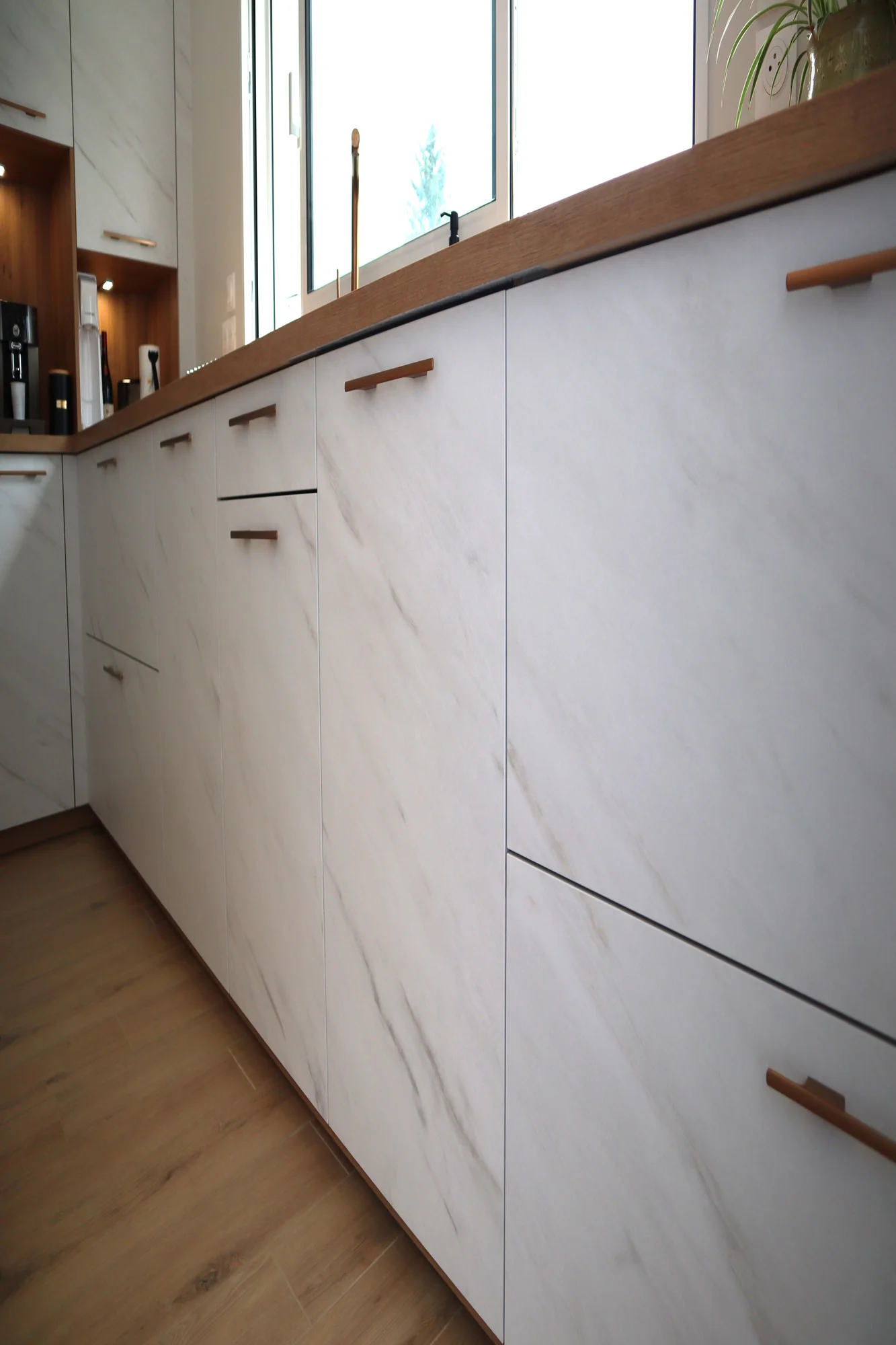 J’ai accompagné le couple dans l’agencement complet de leur séjour : salon et salle à manger. À partir de plans 3D SketchUp avec cotations et de rendus réalistes réalisés avec Enscape, ils ont pu se projeter facilement dans leur futur intérieur grâce à une immersion totale. La cuisine, quant à elle, a été dessinée par Cuisinella. J’ai assuré un rôle de conseil sur le choix des matières et validé l’implantation proposée par le cuisiniste afin de garantir la cohérence d’ensemble.