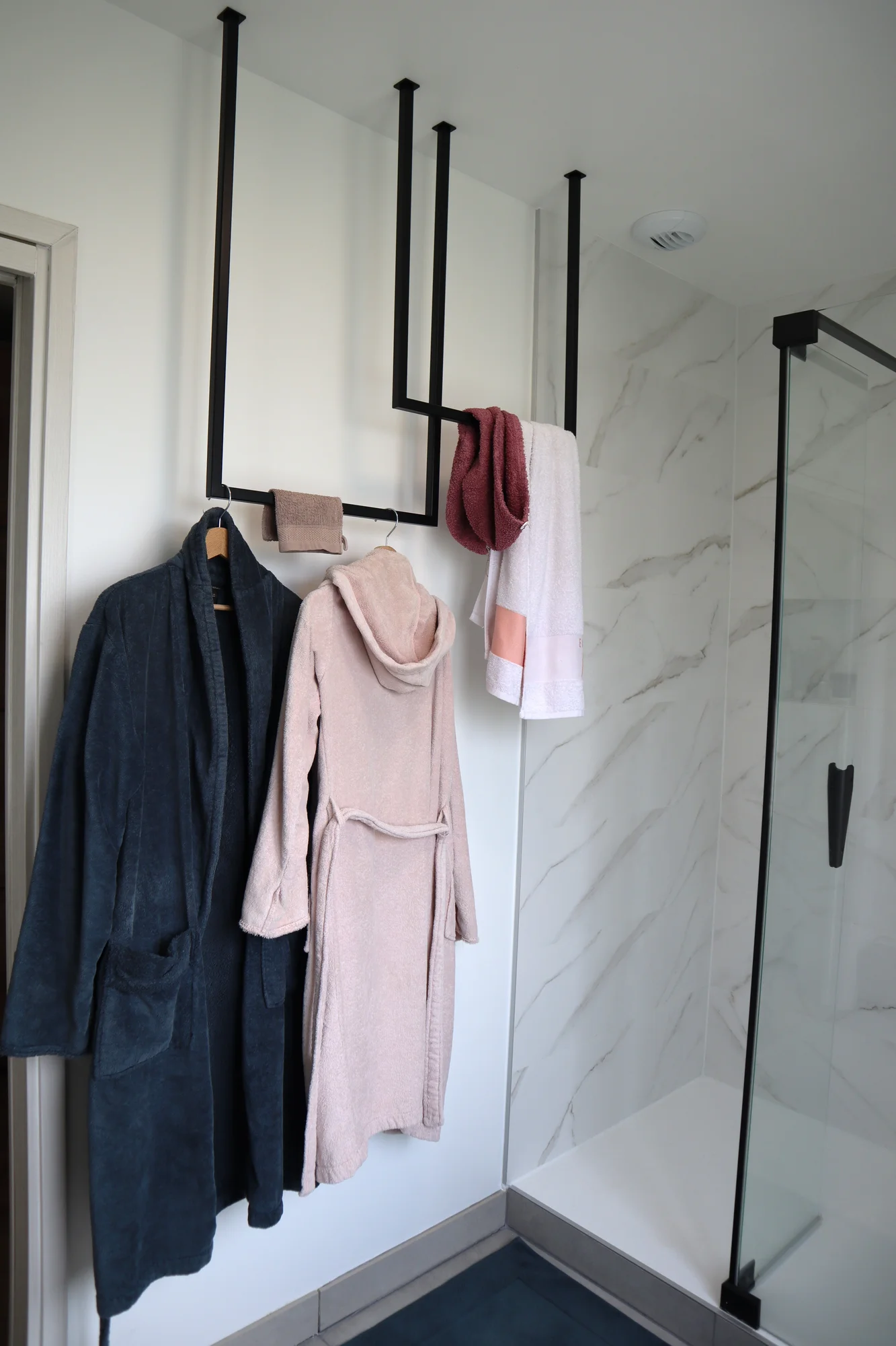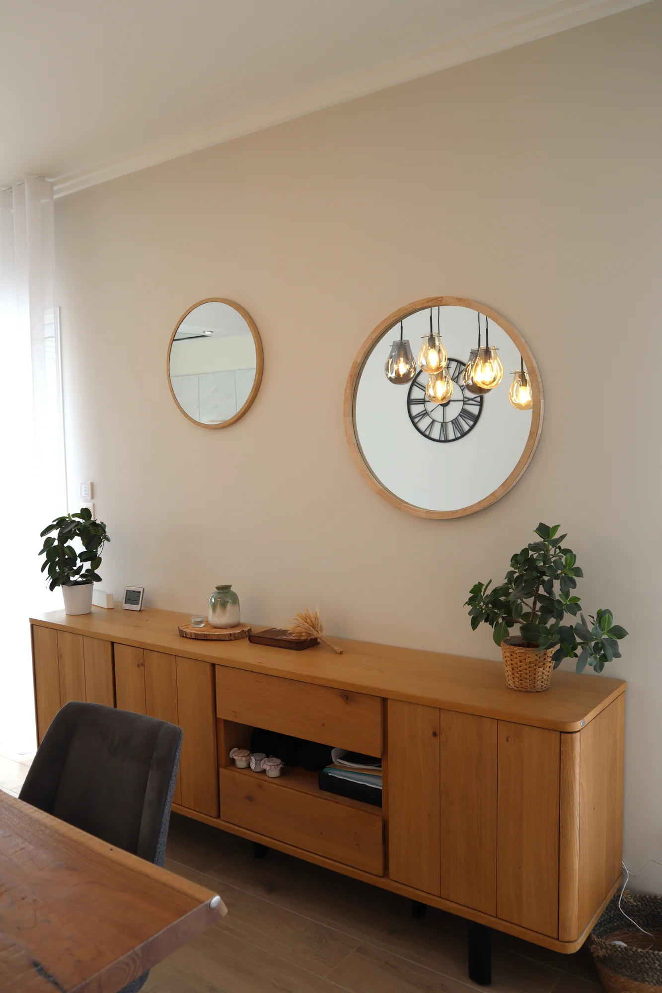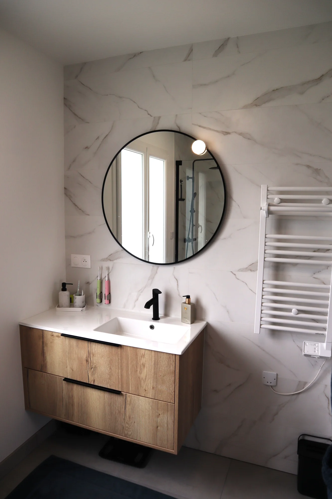 Certains éléments existants ont également été intégrés, comme leurs miroirs ronds en bois ou un lampadaire, pour personnaliser davantage l’espace.
